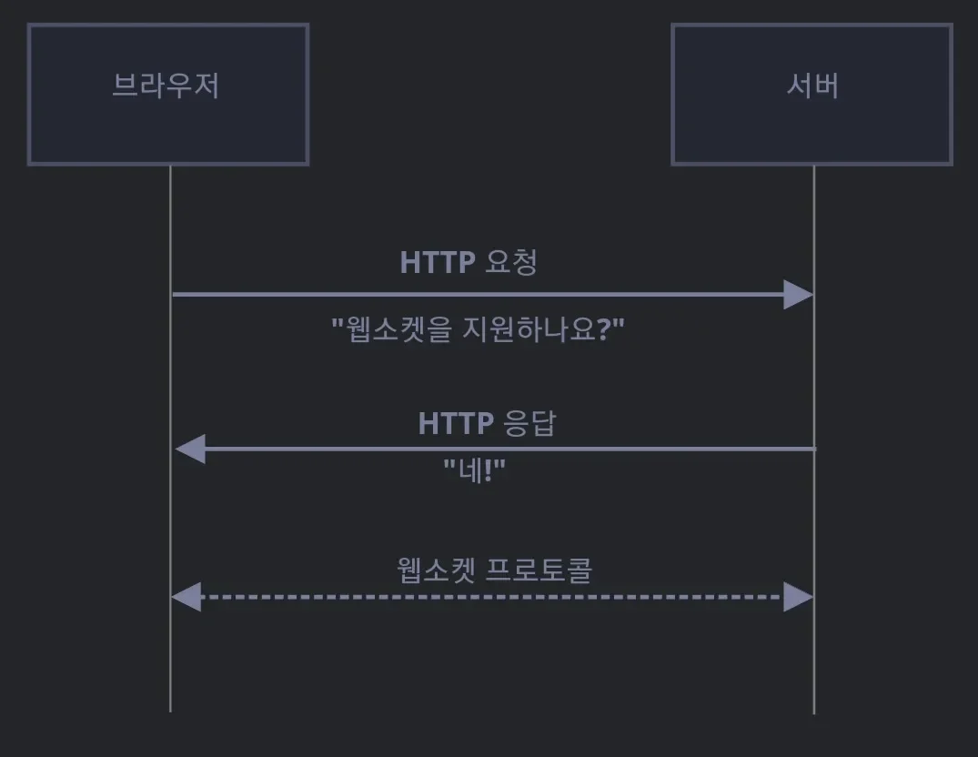 • 핸드셰이크가 끝나면 HTTP 프로토콜이 아닌 웹소켓 프로토콜을 사용해 데이터가 전송되기 시작한다.