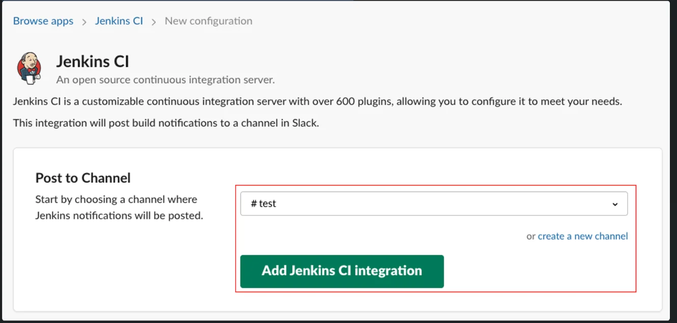 연결할 Slack 채널 검색 후 Add Jenkins CI Integration 클릭