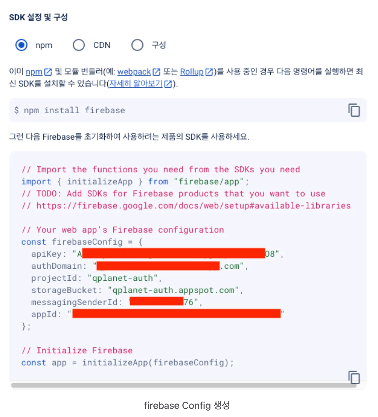 해당 프로젝트에 사용되어야 할 파이어베이스 설정 값을 보내주고 실행시키는 방법을 보내준다.