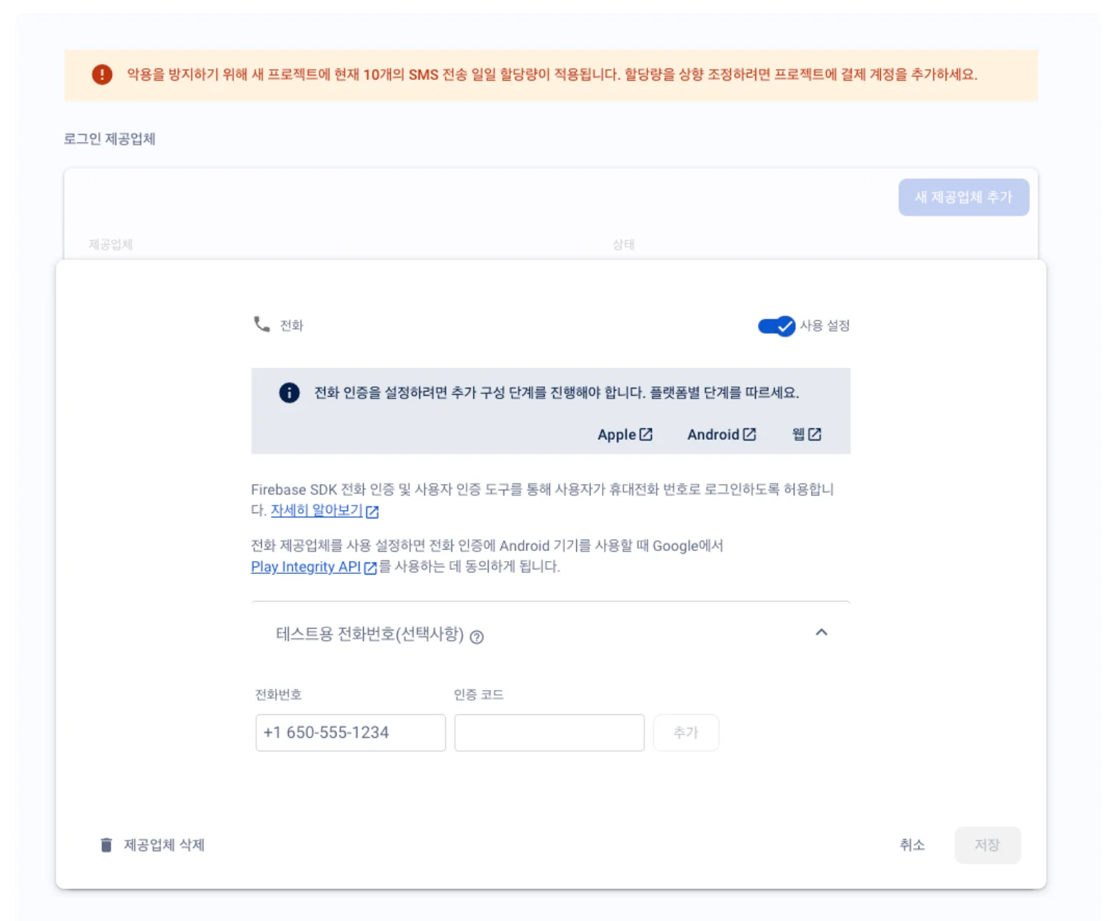 아래 사진과 같이 파이어베이스에서는 10번 이상 인증코드를 보낼 시 추가 요금이 부가되기 때문에 개발자가 테스트를 자유롭게 하기 위해 테스트용 전화번호를 추가할 수 있는 시스템도 있다. 이렇게 설정할 시 본인이 설정한 전화번호와 인증코드를 추가할 수 있다. 하지만 이렇게 전화번호를 추가할 시 추가한 번호로 된 휴대폰에는 인증코드를 받을 수 없다. 즉 signInWithPhoneNumber를 실행하여도 본인 휴대폰에 인증코드가 보내지지 않는다는 뜻이다. 그리하여 실제 본인 휴대폰에 전달되는지 확인하고 싶으면 테스트용 전화번호에 추가하지 말아야 한다.