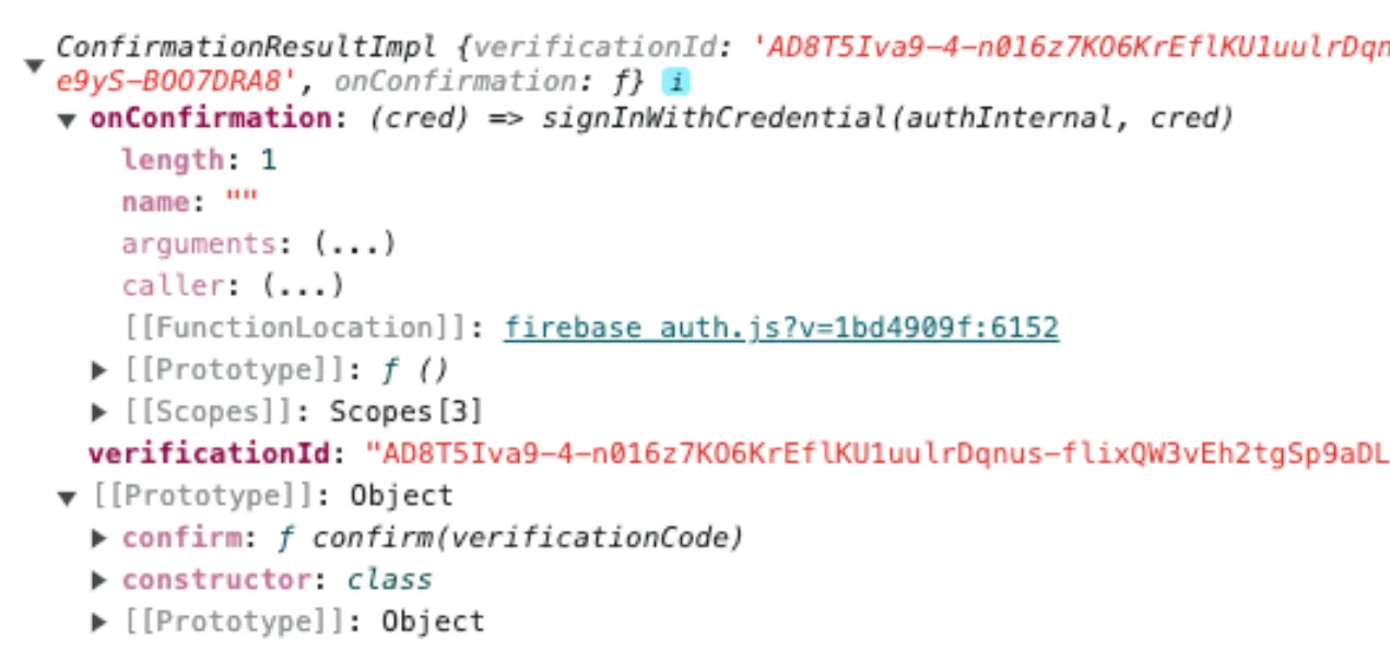 SigninWithPhoneNumber의response로는 인증Id인verificationId와 confirmation 관련 callback 함수인onConfirmation그리고 해당 인증코드를 검증할 수 있게해주는confirm메소드를 지원하는 것을 볼 수 있다.
