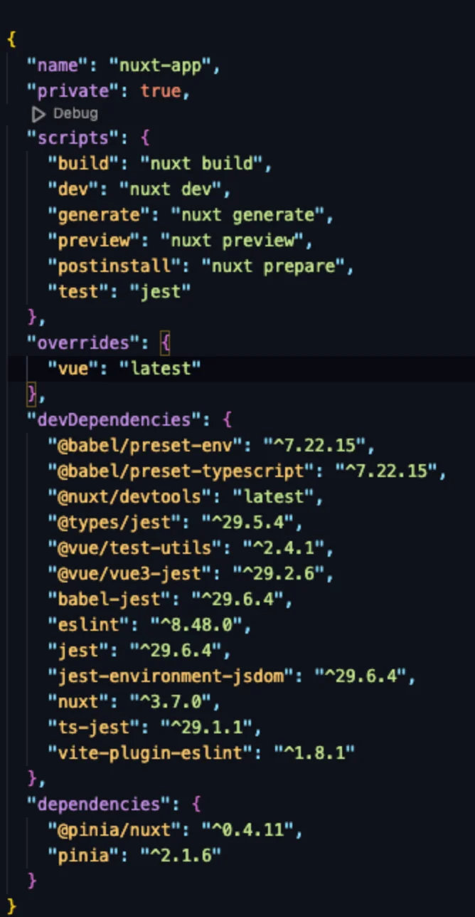 • .nuxt : 기본적으로 Nuxt는 성능상의 이유로 nuxi dev 또는 nuxi build를 실행할 때 type을 확인하지 않으며 type 체킹을 실시할 시에 yarn nuxi prepare 명령어로 .nuxt 디렉토리를 만들며 타입을 생성한다.