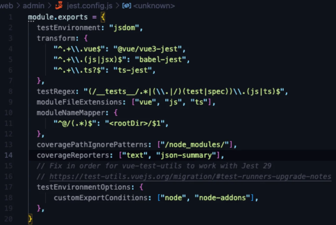 • transform: 트랜스파일 과정에서 사용되는 플러그인이 파일마다 다르므로 jest configuration 안에서 어떤 파일에 어떤 babel plugin을 사용할 지 transform 옵션을 통하여 vue파일은 @vue/vue3-jest로 js/jsx 파일은 babel-jest로 ts 파일은 ts-jest로 진행을 한다.